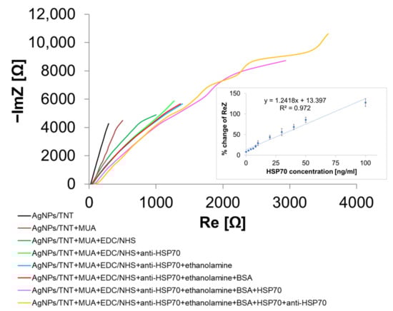 Figure 7a shows the Nyquist plot after the successive steps of the functionalization of the AgNPs/TNTs electrode and the immobilization of anti-HSP70 and HSP70 antigens. The impedance spectra in the Nyquist plot consisted of two parts: very small semicircles at the highest frequencies indicating an electron transfer controlled process, and parts of an incomplete larger semicircle corresponding to a diffusion-controlled process. The lowest impedance modulus value is observed for unmodified AgNPs/TNTs, proving the good conductivity of this substrate. After sample incubation in MUA, there was an increase in the real and imaginary parts of impedance, and therefore in the impedance modulus, which proves the formation of the SAM. The addition of EDC/NHS also blocked the kinetics of electron transfer. Similar changes were observed after the immobilization of anti-HSP70, as well as blocking the reactive sites of the substrate with ethanolamine. The lack of changes in impedance parameters after the immobilization of the BSA confirms the effective use of ethanolamine. Immobilization of the antigen resulted in rapidly increased resistance of the biosensor, which proves the antibody-antigen complex formation. Re-immobilization of HSP70 antibodies and the expected changes in impedance parameters confirmed the complex formation, which increased the thickness of the insulating biological layer. The demonstrated changes in impedance parameters after the functionalization are commonly observed in the literature and confirm that it was carried out correctly [38,39,40]. The HSP70 calibration curve (Figure 7) shows the relationship between the antigen concentration and the real part of impedance (ReZ). Changes in the ReZ parameter are given as percentages and represent the difference in the ReZ before the immobilization of the antigen on the substrate (after the immobilization of the antibody) and after anti-HSP70 dropping. The calibration curve shows the linear resistance response of the biosensor, with a correlation coefficient of 0.972. To calculate the limit of detection (LOD), the following equation [96] was used: