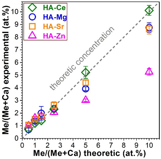Experimental substituent (Me) concentrations reported to the Ca content, as determined on the basis of quantitative energy dispersive X-ray spectroscopy analyses for the hydroxyapatite (HA)-based nanopowders (NPs). The experimental data are presented as means ± standard deviations (n = 4). The theoretical/nominal substituent values are represented by the dashed line.