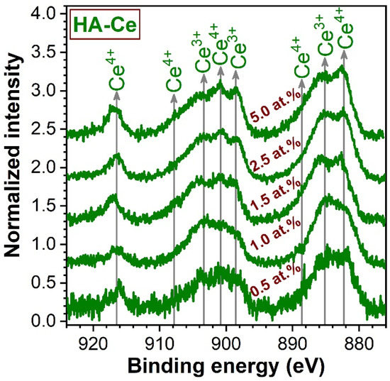 To the difference of the divalent Mg, Sr, and Zn cations, Ce ions can present different valence states (i.e., 3+ and 4+). XPS analyses were carried-out on Ce-HA to infer the valence state of the incorporated Ce (Figure 2). Eight peaks were evidenced and were assigned according to the convention established by Burroughs et al. [58]. The Ce 3d core electron level spectra indicate that Ce3+ and Ce4+ coexist in HA. This was found to be in good agreement with the scientific literature [37]. Both Ce3+ and Ce4+ have higher positive charge than Ca2+ and therefore Ce may substitute Ca by the formation of vacancies [37]. The Ce3+/Ce4+ ratio seemingly decreased with the increase of Ce concentration in HA.