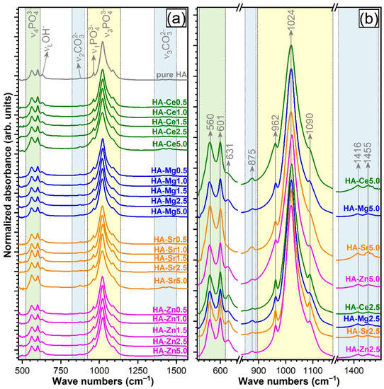Figure 4a shows the FTIR-ATR spectra recorded for both pure and single-substituted HA NPs. All the typical IR absorption bands characteristic to vibration modes of orthophosphate (PO43−) groups in an HA compound were evidenced [62,63]: triply degenerated ν4 bending (~560 and 600 cm−1), nondegenerated ν1 symmetrical stretching (~962 cm−1), and triply degenerated ν3 asymmetric stretching (~1020 and 1090 cm−1). The band at ~631 cm−1, attributed to νL libration mode, indicates the presence of hydroxyl groups (OH–) in the HA structure. Furthermore, typical vibrations of carbonate groups were revealed for all HA NPs: ν2 stretching vibrations of (CO3)2− (~875 cm−1) and ν3 asymmetric stretching of (CO3)2− (~1420 and 1451 cm−1). The position of these bands suggested a B-type carbonate substitution (i.e., in the lattice sites of (PO4)3−) [6,62,64]. One should stress that the main bone mineral component is actually a carbonated HA (primarily B-type [65]), substituted with microelements.