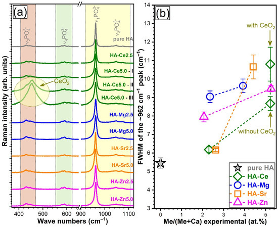 The full-width at half maximum (FWHM) of the intense band positioned at ~962 cm−1 enlarged with the substituent concentration from 2.5 to 5 at.% (Figure 5b), irrespective of the type of substituent. A significantly larger increase was noticed for the Sr-HAs (Figure 5b). This is indicative of a more substantial lattice distortion upon Sr incorporation. Large FWHM values were also recorded in the case of the Ce-HA with the highest substituent concentration when the secondary CeO2 phase was detected in the spectrum. The lesser distortions were observed for the Mg- and Zn-substituted HAs.
