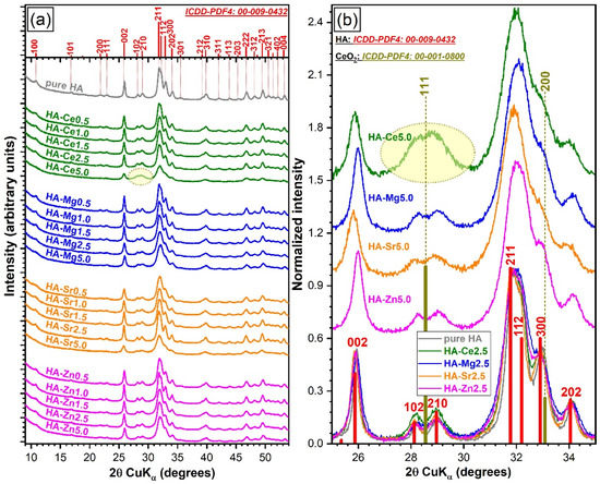 The XRD patterns of the pure and substituted HA powders are represented comparatively in Figure 6a. All samples, with the exception of HA-Ce5, exclusively consisted (at the sensitivity limit of the employed analysis equipment) of a hexagonal HA phase (ICDD: 00-009-0432, space group P63/m (176)). Up to a dopant concentration of 1.5 at.%, the XRD patterns of all SHAs elicited seemingly unchanged well-resolved, fairly broad (indicative of a nanocrystalline material) maxima, which advocated for a preservation of the structural features. The first discernible structural modifications were noticed in the cases of HA-Mg2.5 and HA-Sr2.5 NPs. HA-Mg2.5 and HA-Sr2.5 NPs presented broader/less-resolved and sharper/better-resolved (similar to the ones of pure HA) diffraction maxima (Figure 6a), respectively, with respect to the corresponding SHA NPs with cation substitution levels in the range 0.5–1.5 at.%.