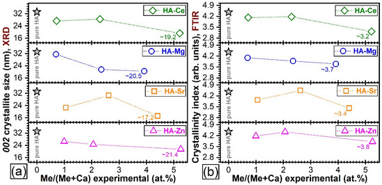 A marked modification of 002 crystallite size (crystalline coherence length along the c-axis) was noticed in the case of Mg2+ (i.e., a decrease) and Sr2+ (i.e., an increase) substitutions at a concentration level close to ~2.5 at.% (Figure 7a). This was also fairly well-supported by the evolution of the CI values (Figure 7b). Less evident changes were noticed in the case of Ce and Zn dopants at similar intermediate concentrations. Likewise, in the case of highest-used substituent concentration, the FTIR-ATR spectroscopy (Figure 4) and XRD (Figure 6) naked-eye observations were found to be in full agreement with the mean crystallite size and CI values. Explicitly, the lowest crystallite size and CI values were recorded in the case of the HA-Ce and HA-Sr NPs (Figure 7a,b).