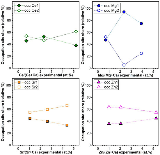The Rietveld refinement analysis of the XRD patterns suggested that Sr can occupy the Ca(I) (e.g., occSr1) and Ca(II) (e.g., occSr2) sites in similar shares when in low concentrations. A preferential occupation for the Ca(II) site was recorded for Sr concentrations larger than 2.5 at.% (Figure 8). Ce adopted similar occupation sites to Sr in HA, with a preference for the Ca(II) occupation site at the largest concentration. Furthermore, it was revealed that despite their almost equal ionic radius, Zn prefers to occupy the larger site (II), while Mg the smaller site (I) (Figure 8). This result is in good agreement with the determinations made by Tang et al. [6,71] and Ren et al. [6,72].