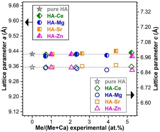 Figure 9 presents the modification of the HA lattice parameters as a consequence of the cation substitution (as inferred by the Rietveld structural refinement of the XRD diagrams). HA crystallises in the hexagonal system (space group P63/m (176)) with two formula units per unit cell, each with 44 atoms. The a and c lattice parameters of pure HA were found to be of 9.4250 and 6.8826 Å, respectively, thus in good agreement with the values obtained in the scientific literature [1,73].