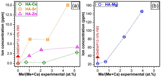 A first important observation is that Ce was released in extremely low contents (0.17–0.27 ppm) up to a substitution level of ~2.5 at.%. Only for the highest doped Ce-HA a more perceptible Ce ion release (of ~2.8 ppm) was evidenced (Figure 10a). This contrasted with the trend recorded for Mg-HAs. Mg was released in a dose-dependent manner, eliciting a quasilinear evolution with the substituent concentration (Figure 10b). Its faster release compared to other elements was conspicuous, reaching a maximum value of ~124 ppm (after the deduction of Mg experimental concentration of the testing medium), which was ~44 times higher with respect to Ce-HA. Sr and Zn are also released in a dose-dependent manner, with the notable exception of HA-Sr2.5, which presented a similar leached Sr concentration to HA-Sr0.5. This can be associated with the improved crystalline quality observed for the HA-Sr2.5 (see Figure 6a and Figure 7a).