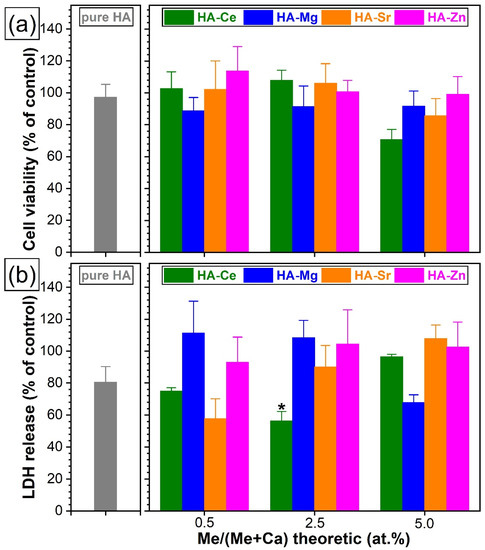 The in vitro evaluations debuted with a cytotoxicity screening test (performed in accordance to ISO 10993-5:2009 recommendations) on a mouse fibroblast cell line (NIH/3T3, ATCC® CRL−1658™). The cell viability and death were assessed by MTS and LDH tests, respectively (see Figure 11). The pure HA NPs presented a cell viability response comparable to the one recorded for the biological control (i.e., the cell culture medium without sample). The SHA NPs elicited similar cell viability results as compared to the pure HA (without statistically significant differences, p > 0.05), with one exception, the SHA NPs with the highest content of Ce (p < 0.05) (Figure 11a). The reduction in cell viability can be ascribed to the presence of the secondary nano-sized CeO2 phase (Figure 5 and Figure 6) [78]. A lower LDH release was signalled in the case of pure HA with respect to the control (Figure 11b). The LDH data further indicates that HA NPs substituted with Ce, Mg, Sr, or Zn showed no statistically significant differences (p > 0.05) with respect to pure HA. Only in the case of HA-Ce2.5 a slight inhibition of the LDH activity was noticed (p < 0.05). Consequently, it was decided to further evaluate the biofunctional response of all these type of HA NPs (without any exclusion) with respect to two relevant human (i.e., osteoblast hFOB 1.19 (ATCC® CRL-11372) and endothelial EAhy 926 (ATCC® CRL-2922™)) cell lines.