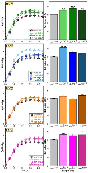 The cell responses obtained for the SHAs were compared to the pure HA by estimating the p-value via a one-way ANOVA multiple analysis comparison followed by a Dunnett’s post hoc test using the statistical analysis GraphPad Prism v.7 software (GraphPad Software, San Diego, CA, USA).