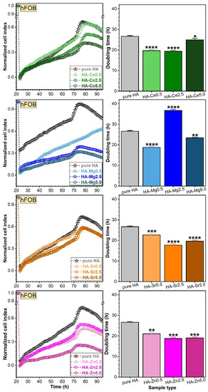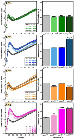 The dopant concentrations released by the SHA NPs in the DMEM/F12 culture medium (Sigma D6421) supplemented with 10% FBS, after 48 h of incubation, as assessed by ICP-MS measurements are presented in Figure 10.