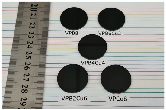 Five distinct CuO-doped VPB glass samples [5] were thoroughly studied in this study in terms of their nuclear attenuation shielding characteristics, effective conductivity, and accumulation factors. Figure 1 shows the physical appearances of Cu-doped VPBxCuy glasses along with their codes The chemical properties of the glass samples under examination can be listed as follows: