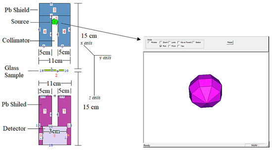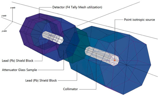 As a result, models of the VPBxCuy glass specimens were created based on their elemental compositions (in percent weight) and material densities (in grams per cubic centimeter) and were then tested. The glass specimen had a radius of 5 cm and a cylindrical form. As a result, the material characteristics needed for cell cards were included in the card’s border design (i.e., elemental mass fraction and material density). Illustration of a two-dimensional (2-D) perspective and dimensions of the proposed MCNPX simulation setup for testing the gamma ray transmission capabilities of VPBxCuy glasses is shown in Figure 2 (obtained from MCNPX Visual Editor VE VisedX22S). The modeled point isotropic source may alternatively be viewed as an extension of the overall gamma ray transmission arrangement in Figure 2. The elemental mass fractions of the fabricated VPBxCuy glasses are listed in Table 1. It should be noted that the Mn variable was used in the MCNPX INPUT file to indicate the elemental composition of the glass specimens, which should be recorded. After completing the first cell description process, it was determined that photon and electron interactions (i.e., IMP: p, e) were significant. The MCNPX code, which implements a variance reduction technique, may be regarded as an example of such a method. However, on the opposite side of the VPBxCuy glass material, a detector field (F4 Tally Mesh, KnitMesh Technologies Ltd., Greenfield, UK) was installed for the purpose of counting attenuated gamma rays. In order to determine the photon flux on an average basis at a point or in a cell, this kind of tally mesh may be used to assist. In all, 108 particles with different photon energies were used in each glass sample, with each run being performed twice (i.e., from 0.015 MeV to 15 MeV). Overall, MCNPX had an uncertainty of less than 1%. Finally, Figure 3 shows the 3-D view of designed MCNPX simulation setup for gamma ray transmission competencies of VPBxCuy glasses (obtained from MCNPX Visual Editor VE VisedX22S). As can be observed in Figure 3, the beam axis of primary gamma ray was set on the z-axis.
