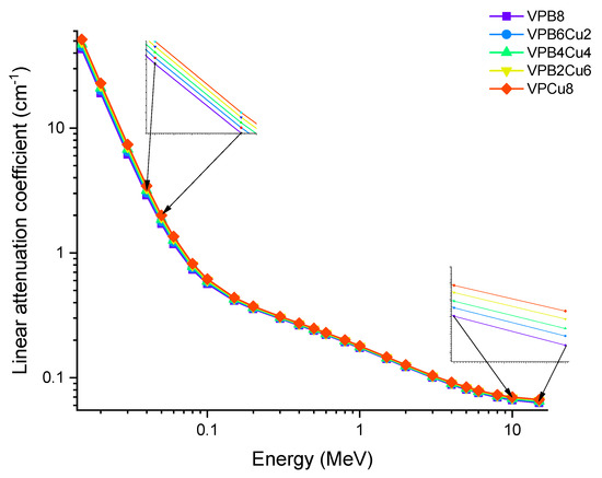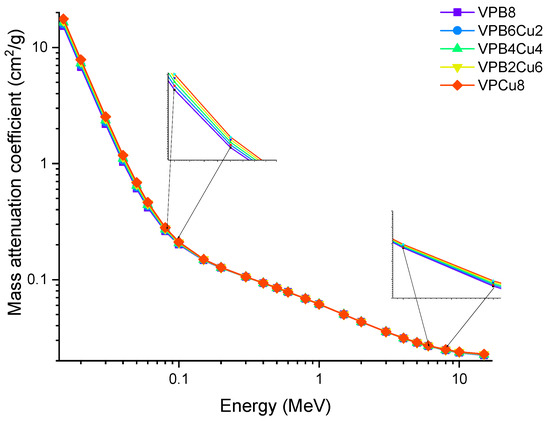Photon energy has a significant effect on the linear attenuation coefficient (μ) of the investigated glass samples, as shown in Figure 4 (from 0.015 MeV to 15 MeV). To get energy, photons may do so by one of two methods, both of which include the usage of electrons. For example, in one instance, a photon is fully devoured; in another, just a portion of the photons is absorbed, leaving the other photons dispersed. The photoelectric effect seems to be greater for low-energy photons (0.1 MeV) than for high-energy photons (0.8 MeV). As the Z number increases, the likelihood of this interaction occurring increases dramatically as well [20]. The Compton effect is most noticeable when photons have a medium to high energy (>0.1 MeV). Pair formation happens when photons have an energy higher than 1.02 MeV and collide with one another. Because of these kinds of interactions, it is reasonable to infer that the linear attenuation coefficient is energy dependent, and that it changes according to the photon energy regions in which it occurs. A rapid decrease in the LAC values was observed in Figure 4, between 0.015 and 0.08 MeV, where the photoelectric effect is dominant. As with the first region in the graph, a smooth decrease was observed in the second region pertaining to the superiority of Compton scattering. The results indicate that LAC values were highest for the VPB8 glass sample. This can be justified by the amount of CuO enforced in the sample. As seen in Table 1, VPCu8 has the highest density (i.e., 2.9235 g/cm3) and has the highest percentage of CuO when compared to the other samples. The increase in CuO concentration in the glass samples resulted in a substantial increase in density as well. The sample with 0% Cu (i.e., VPB8) has the lowest density (2.8123 g/cm3), whereby the sample with 8% CuO has the highest density (2.9235 g/cm3). The aforementioned situation is due to the higher atomic number of Cu (Z = 29). The fluctuation of the mass attenuation coefficient (μm) as a function of photon energy is seen in Figure 5.