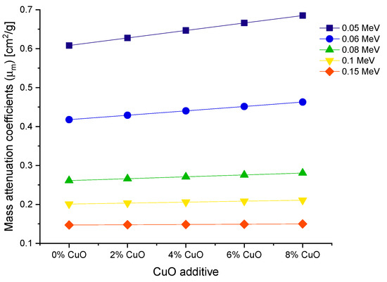 Variation of mass attenuation coefficients as a function of increasing CuO reinforcement.
