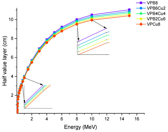 Variation of half value layer (T1/2) against photon energy for VPBxCuy glass samples.