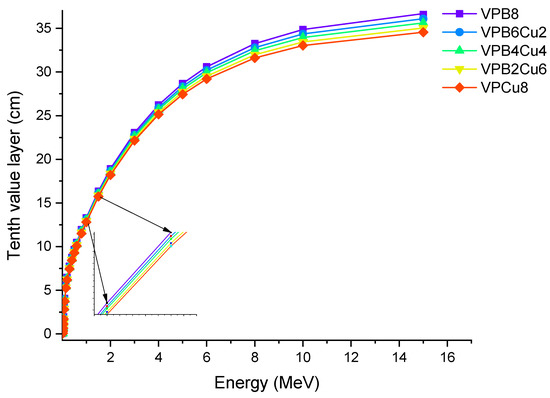 Figure 7 shows the variation of T1/2 as a function of photon energy. With increasing photon energy, we found a direct increase in the glass thickness required, resulting in a 50% reduction in incident photon intensity. Changes in the penetrating qualities of energetic photons as they transition from low to high energy levels can explain this. To put it another way, higher-energy photons will necessitate thicker materials in order to reduce their intensity by half [24]. As discussed earlier, VPCu8 has the highest μ values. Therefore, it is worth noting that the HVL and μ values have an inverse relationship (see Equation (5)). As a result, higher μ values can result in lower T1/2 levels, and vice versa. Our findings that the sample VPCu8 had the lowest T1/2 values among the studied glass samples verified this fact. At 0.03 MeV, T1/2 values of the samples were 0.112, 0.107, 0.102, 0.097 and 0.094 cm for samples VPB8, VPB6Cu2, VPB4Cu4, VPB2Cu6 and VPCu8, respectively. The variance of the tenth value layer as a characteristic of photon energy is depicted in Figure 8.