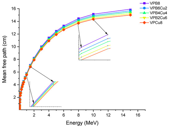 For the glass samples analyzed, a similar fluctuation pattern was observed with HVL. VPCu8 was likewise found to have the lowest T1/10 values. This result confirms the efficiency of the sample in terms of halving the primary radiation intensity and reducing it to one tenth of its original level. MFP is the average distance traveled before an encounter by photons. We calculated the MFP values of the glass samples in terms of their attenuation characteristics as a function of the average distance travelled by an incident photon [25,26]. Figure 9 shows the MFP variation as a function of photon energy for all glass samples. With rising photon energy, the average travel distance of an incoming gamma ray rose. It can be explained by photons’ direct penetration properties, which are affected by their initial energy. The minimum MFP values can be taken as a sign of greater gamma ray attenuation because it indicates that the incident photon’s average traveling distance is also the shortest. The results revealed that sample VPCu8 has the lowest MFP value. This can be explained by the atomic structure and material density of VPCu8, which had a tight atomic structure and a greater density (2.9325 g/cm3), preventing the gamma photons from passing through. For instance, at 0.03 MeV the MFP values were 0.162, 0.154, 0.14, 0.141 and 0.135 cm for glass samples VPB8, VPB6Cu2, VPB4Cu4, VPB2Cu6 and VPCu8, respectively.