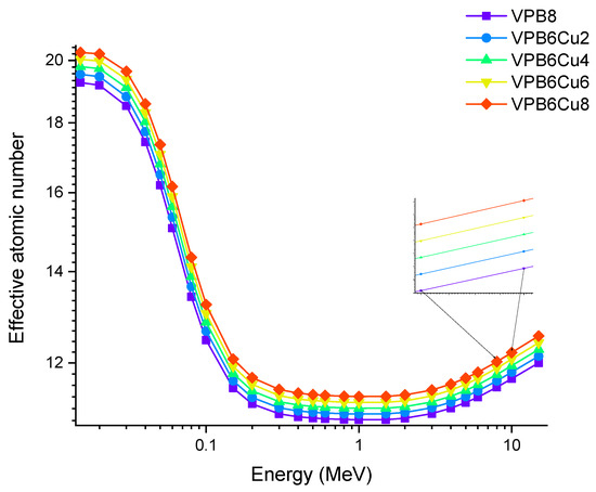 Figure 10 depicts the change in effective atomic number (Zeff) values as a function of photon energy. In general, higher-atomic-number elements are thought to have better gamma ray attenuation. Furthermore, materials having a higher fraction of elements with higher Z values absorb gamma rays more effectively. The obtained results showed that VPCu8 has the highest Zeff value. The maximum difference in Zeff values was seen at 0.04 MeV as 17.43,17.73,18.03,18.31, and 18.58 for glass samples VPB8, VPB6Cu2, VPB4Cu4, VPB2Cu6 and VPCu8, respectively, in the region where photoelectric interactions are predominant. In our study, it was observed that as the % of CuO increases, Zeff values increase proportionally.