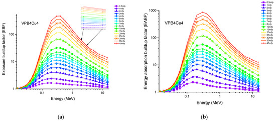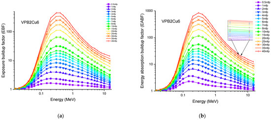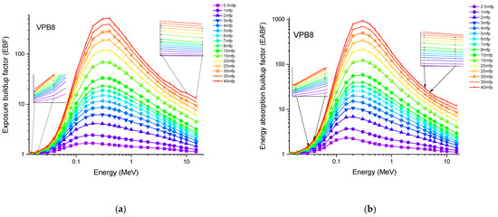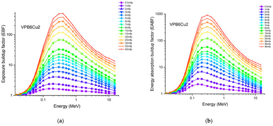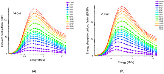 Accordingly, the glass sample with 0% CuO (VPB8) has the lowest Zeff values. The EABF and EBF are significant photon shielding characteristics that are used to define scattering in irradiated materials. The variance in EBF and EABF values for all glass material was analyzed using the geometric progression (G-P) fitting technique for the energy range 0.015 MeV to 15 MeV and penetration depth range of 0.5 to 40, mfp, as shown in Figure 11a,b, Figure 12a,b, Figure 13a,b, Figure 14a,b and Figure 15a,b. It increases with decreasing incoming photon energies until it reaches a maximum in the intermediate energy range, at which point it begins to decline again. The majority of the gamma ray absorption occurs at lower energies, where the photoelectric effect is prominent, and at higher energies, when photoelectric interactions are predominant, according to the literature. The accumulation of photon energy is restricted in these energy zones. For its part, Compton scattering is the most often observed process at intermediate energies because it includes photon absorption rather than absolute photon loss. As a consequence, the EBF values in the Compton area are at their highest levels ever recorded in the region. In this study, EBF values were observed to be the lowest for sample VPCu8. It is worth noting that as the content of CuO in a sample increases, the EBF values decrease. For example, at 0.1 MeV and 40 mfp the EBF values for were 43.622 and 30.634 for samples VBP8 and VPCu8, respectively. The EABF component is a quantity influenced by the amount of energy in the substance as well as the detector characteristic in the interacting material. A variation trend similar to that seen in EBF is observed for EABF. Likewise, the lowest values are reported for the sample with the highest CuO content, VPCu8.