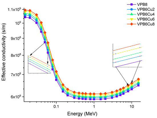 Finally, Figure 16 depicts the variation in effective conductivity (Ceff) for all glass samples at 300K (s/m). The effective conductivity Ceff (s/m) values of the examined glass samples were obtained in the photon energy range of 0.015–15 MeV. The effective conductivity Ceff (s/m) of a shielding-material for attenuation at room temperature (300 K) is proportional to the effective number of electrons per gram. As observed in Figure 16, Ceff has an inverse relationship with photon energy, that is, as the energy increases, Ceff values decrease rapidly, especially in the region where photoelectric interactions are dominant [27]. Furthermore, the sample with the highest CuO content (VPCu8) has the highest Ceff values at all photon energies.