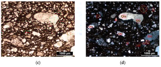 Petrographic observations: observation on matrix of BDX 24418 ((a) plane-polarized light, (b) cross-polarized light); observation of matrix of BDX 24419 ((c) plane-polarized light, (d) cross-polarized light). The identified minerals are mainly quartz (Qtz), altered feldspars (Fs) and mica (indicated by the circle).