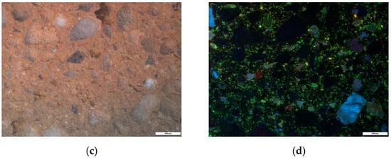 As in the wheel-made samples, the main colors seen in CL were a blue luminescent color highlighting the presence of potassium feldspars, the yellow-green luminescence representing plagioclases, and a brownish luminescent color combined with non-luminescent minerals, which represent the quartz inclusions (Figure 2) [25].