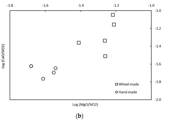 Furthermore, it was noted that two groups of chemical composition can be distinguished by the Al2O3, SiO2, CaO, and MgO content (Table 3), in concordance with the manufacture-type groups. The group represented by the potsherds made by wheel is more abundant in MgO, Al2O3, and CaO contents, with less SiO2 content. In order to achieve a better visualization of these two groups, binary diagrams using log-ratios on Al2SiO3/SiO2-MgO/SiO2 and CaO/SiO2-MgO/SiO2 were made (Figure 4). The differences observed between the two groups for microtexture and mineralogy are reinforced by the chemical data. Based on these results, it is most likely that the clay sediments employed are different and were chosen to adapt to the manufacturing technique (more inclusions for the hand-made ceramics).