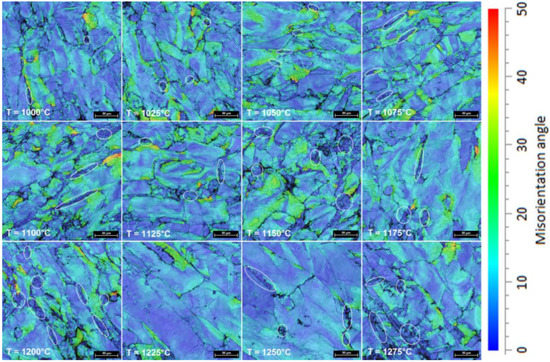 Figure 6 shows a series of representative GROD distribution maps of samples processed by upsetting, from 1000 °C to 1275 °C, with a total deformation degree of 30%. Analyzing the GROD evolution, one can identify the following: for temperatures between 1000 °C to 1175 °C, the maximum GROD is registered for the δ-phase; while for temperatures between 1200 °C to 1275 °C the maximum GROD is registered for the γ-phase. Analyzing the GROD evolution in the case of δ-phase, it was observed that the GROD increases from 38° (at 1000 °C) to 49° (at 1100 °C), when maximum GROD is recorded, followed by a continuous decreasing to 21° (until 1275 °C). Analyzing the GROD evolution in the case of the γ-phase it was observed that the GROD increases from 26° (at 1000 °C) to 44° (at 1200 °C), followed by a continuous decreasing to 32° (until 1275 °C). It can also be observed that within the δ-phase areas, where GROD shows low-values (marked with white circles); this indicates the recrystallization (RX) occurrence in δ-phase grains.