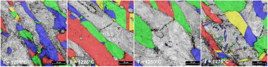 The analysis of microstructure evolution, from 1000 °C to 1275 °C, showed the presence of the following constituent phases: ferrite (δ-phase)—blue colorized, primary austenite (γ-phase), and secondary austenite (γ2-phase)—red color, and σ-phase—yellow color. At temperatures below 1050 °C, the presence of deleterious σ-phase can be observed, mainly at the δ/γ interface, the decreased quantity of σ-phase fraction, indicating that the dissolution of σ-phase is completed at 1050 °C. Another important observation can be made for temperatures above 1175 °C, where one can observe the presence of a secondary austenite phase (γ2-phase), mainly within the δ-phase at the δ/δ interface. This secondary austenite (γ2-phase) is generated during heating within an intensely deformed δ-phase matrix by heterogeneous nucleation, in sections where the supersaturation in N of the δ-phase is supporting the precipitation phenomenon. Furthermore, the microstructure inclusions are working as preferential nucleation sites for the γ2-phase, which can easily nucleate next to these inclusions [28,29].