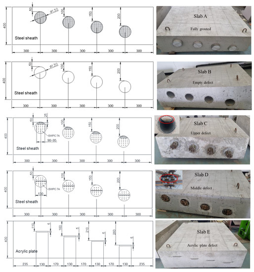 Several concrete specimens containing various defects were constructed according to standard concrete casting and curing criteria. The thickness of the test piece was 400 mm, and defects were installed using a steel duct and acrylic plate. The drawings and manufacturing results are shown in Figure 1. Slab A had a fully filled duct, slab B had an empty duct, slab C had an incompletely filled duct on top with insufficient grouting, slab D had a duct with a delamination defect in the middle of the duct, and slab E had a duct with a general delamination defect. For slabs A to D, four duct depths of 50, 100, 150, and 200 mm were examined, and for slabs D to E, delamination defects with four depths of 110, 160, 210, and 260 mm were considered. Testing for a depth of 400 mm (N400) of intact concrete without ducts and defects was conducted in the area between ducts and between acrylic plates.