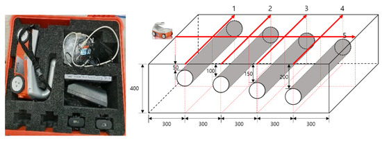 EM waves are reflected from the interface of two objects with different permittivity. Based on this basic principle, RC radar for concrete is extensively used, and it easily verifies poor construction or internal reinforcement information because it responds sensitively to reinforcing bars, piping, and PC steel inside concrete. In this study, the StructureScan Mini LT (GSSI) was used as the RC radar equipment. This equipment has a measurement depth of 500 mm and was suitable for the specimens in this study. As shown in Figure 2, the test was conducted at four duct lines and one line in the direction perpendicular to the duct. Five specimens were measured at the same point.