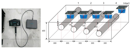 A tomography (B scan) analysis using S wave was performed using a Pundit 250 array with 24 sensors, as shown in Figure 3. Array equipment with dry point contact technology collects 56 A-scans at one point of measurement, and real-time B scans are obtained using the SAFT algorithm. The S wave was measured at four depths and at intact positions, and it was measured at the same point for a total of five specimens.