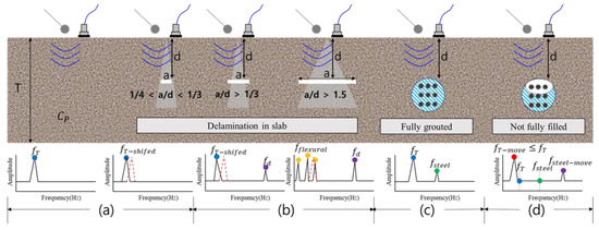 IE has been studied for various types of defects, and its characteristics are shown in Figure 5. In Figure 5a, the estimation of the thickness mode frequency (ft) for concrete without internal defects is the same as in Equation (1) [11] (p. 2). If there are voids and cracks with 1/4 < a/d < 1/3 inside, ft is shifted to a lower frequency. Here, is the correction factor, is the p-wave speed, and is the slab thickness.