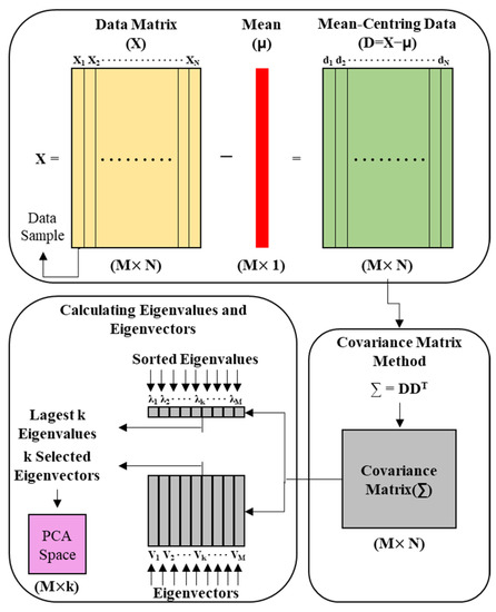 PCA uses orthogonal transformations to transform samples in a high-dimensional space that are likely to be related to each other into a low-dimensional space. PCA was proposed by Pearson (1901) and later developed by Hotelling (1936) and Jolliffe to establish the modern theory [36,37]. PCA linearly transforms data into a new coordinate system such that when data are mapped to one axis, the axis with the largest variance is placed as the first principal component and the second largest component is placed as the second principal component. Therefore, PCA is a method of dividing the sample difference into components that best represent such difference, and the procedure is shown in Figure 6 [38]. Because it is not possible to quantify the degree to which the major frequency that theoretically occurs in the IE spectrum is shifted by type, PCA was used in this study to derive the main components for ft, ff, and a certain range of features appearing in the IE spectrum for the duct and delamination defects.