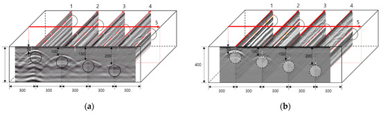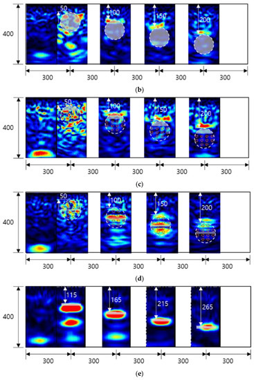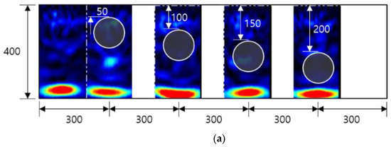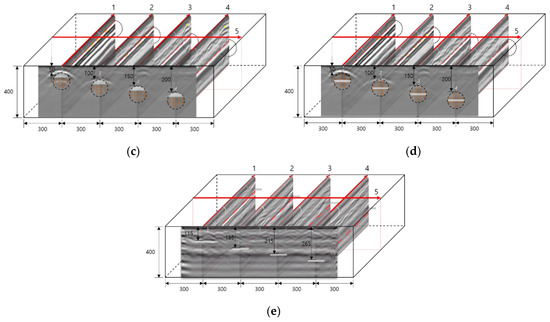 Tests were performed following the same procedure for specimens A to E using RC radar, and the resulting images were extracted using RADAN7, a commercial program provided by GSSI. The results of matching the extracted B scan to five specimens are shown in Figure 7. In general, when the duct was close to the concrete surface, the energy of the reflected wave was large, and it weakened when the depth of the duct was increased. In the B scan, most of the energy was reflected from the steel duct; thus, it was difficult to evaluate the degree of grouting inside the concrete, and the delamination defect depicted with the acrylic plate in Figure 7e was not detected. The permittivity of concrete ranges from 5 to 12, the permittivity of steel is 200 or more, and reflected waves are strongly generated due to this large permittivity difference. However, because acrylic has a permittivity of 2.56, the difference is smaller than that of air (permittivity 1) due to delamination defects, which hinders the detection of defects.
