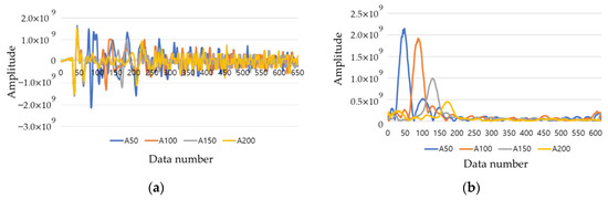As shown in Figure 7, when commercial equipment is used, a quantitative analysis is difficult because only a rough evaluation on the extracted B scan is possible. Therefore, the analysis was conducted using raw data collected from RC radar. Figure 8a shows the raw data at the center of the duct of slab A, and Figure 8b shows the result of performing the Hilbert transform. Through the converted result, it is possible to determine the degree of energy attenuation according to the location and depth of the duct. The same procedure was performed for slabs A to E at the normal position, and the results are shown in Figure 9.