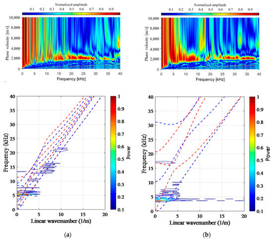 Phase velocity dispersion curves for normal and delamination defects. (a) Intact 400 mm (N400); (b) acrylic plate defect 110 mm (E110).