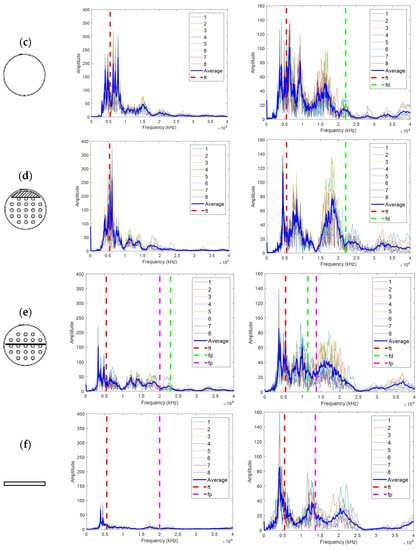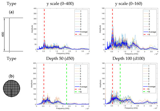 Figure 5d represents a defect type that can occur because of insufficient grouting or unfilled top [12] (p. 2). In this case, shifts in ft and fsteel may occur because of the increase in the movement distance of the elastic wave, and the main frequency is estimated through Equations (4)–(6).
