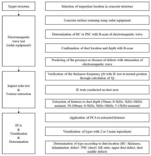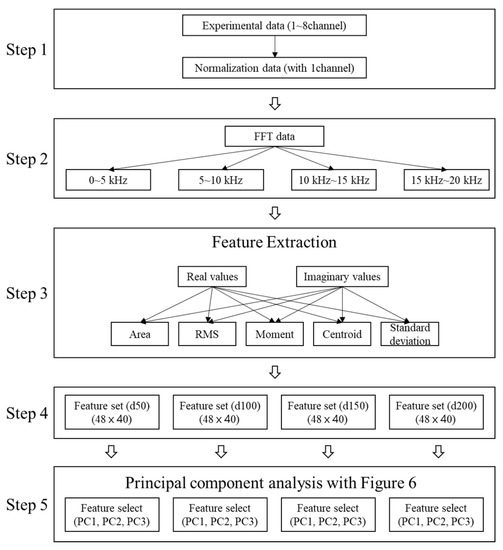 The existing IE spectrum analysis simply detects the occurrence of a new peak in the ft shift, energy attenuation, and high frequency based on Equations (1)–(6) for the concrete slab. However, this may be difficult to determine using the theoretical formula in case of changes of the physical properties of concrete or if there are factors that interfere with the propagation of elastic waves such as ducts. In the case of shallow defects, high-frequency generation due to impact is limited; thus, in addition to the analysis of the peak frequency of the spectrum, various other features need to be considered. Moreover, although analysis of ambiguous results may require professional ability to distinguish between defects and non-defects, PCA analysis enables quick and easy evaluations by classifying the distribution ranges of defects and non-defects. Therefore, in the dynamic response according to the type and depth of the duct, the feature that maximizes the classification was extracted by considering ft (~5500 kHz), ff (2–10 kHz), and fd (10–20 kHz). A total of 40 features were extracted through the four-step procedure shown in Figure 14, and the extracted features were used for PCA in the five-step.