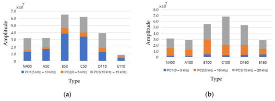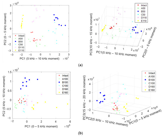 Figure 15a shows the results of using the principal components PC1 (5 kHz–10 kHz moment) and PC2 (0–5 kHz moment) for d50. If two PCs are used, 94% of the characteristics are retained; if PC3 is added, up to 99% of the characteristics are retained. The variances of PC1 and PC2 are and in the new latent variable space. The intact N400, which is a duct- and defect-free range, and A50 with a duct completely grouted were distributed around it. In the case of A50, as most of the characteristics disappear, it is difficult to distinguish with only the spectrum, but it can be classified as normal through PCA. B50 and C50 are similar defects, and the ff mode appears strongly and is distributed on the right side of the graph. D110 and E110 contain similar delamination defects, and although differences occur depending on the presence or absence of ducts, they have similar values in the PC2 standard and are distributed around them. The graph visualizes the values obtained by normalizing the extracted features with PCA. The range in which data are distributed along PC1 and PC2 (x-axis, y-axis) can be considered to be proportional to the energy amplitude of a frequency occurring in the corresponding frequency range. It is possible to overcome the limitations of IE spectrum analysis by analyzing the distribution range of the PCA graph. The d50 type can accurately classify normal, upper, intermediate, and peeling defects using two PCs. In addition, it can be confirmed that they are grouped into similar types. In d100, a/d is 1.5 or less; thus, the ff mode is weakened and the IE mode is dominant, and most of the spectra amplitudes are similar. Therefore, appropriate feature extraction is required for the peak shifted by type for classification. In Figure 15b, when PC1 (0–5 kHz moment) and PC2 (5–10 kHz moment) were used, B100 and E160 were clearly distinguished according to the degree of shift and weak ff of the main mode according to the defect type. The a/d of B100 is 1.3, which is a region where weak ff and IE modes exist similarly, and it seems that the feature of ff occurring above 7600 Hz is well captured. Because the remaining types have overlapping ranges, it was possible to distinguish them through three-dimensional analysis using PC3 (15–20 kHz moment), which is the section where reflected waves from ducts and defects occur. Although some types could be clearly distinguished in d150 and d200, it was difficult to distinguish all six types. This means that as the depth increases, the energy decreases, and it is difficult to distinguish features because of the energy scattering due to the shape of the duct. However, in the PSC structure, because the position of the duct can be identified through EM waves in advance, defects can be sufficiently distinguished by dividing them into a position with a duct (A, C, and D) and a position without a duct (N400, E). In the actual PSC structure, as the case of B (empty duct) is rare, it was excluded; three types of duct interiors, namely, A (fully grouted), C (upper defect), and D (middle defect) could be distinguished; and PCA is expected to be applicable.