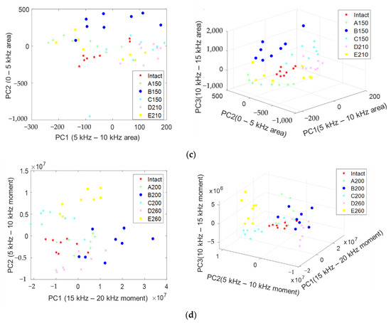 PCA results for defect type and depth. (a) Feature set (d50). PC1: 5–10 kHz moment, PC2: 0–5 kHz moment, PC3: 10–15 kHz moment. (b) Feature set (d100). PC1: 0–5 kHz moment, PC2: 5–10 kHz moment, PC3: 15–20 kHz moment. (c) Feature set (d150). PC1: 5–10 kHz area, PC2: 0–5 kHz area, PC3: 10–15 kHz area. (d) Feature set (d200). PC1: 15–20 kHz moment, PC2: 5–10 kHz moment, PC3: 10–15 kHz moment.