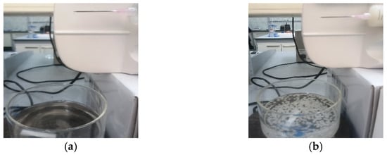 To prepare the ALG and ALG–BPA (1:1) microbeads, first, a 1% solution was prepared by dissolving the desired amount of sodium alginate in hot water and under vigorous stirring. The formed viscous solution was put in an ultrasound bath to eliminate the air bubbles. Half of the solution was put aside to later prepare the ALG microbeads, and the other half was mixed with the BPA to form the ALG–BPA (1:1) microbeads. The ALG and ALG–BPA blend were dripped in a 2% CaCl2 bath for reticulation and microbead formation, as can be seen in Figure 1.