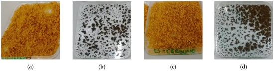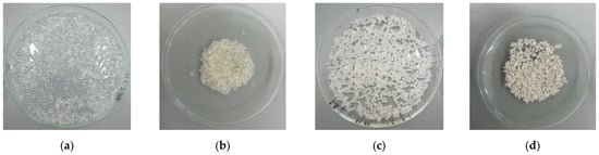 The beads were left overnight for reticulation in the CaCl2 solution and then washed with distilled water until the total removal of Cl− ions (testing with AgNO3). After washing, the beads were left to dry overnight, and they are presented in Figure 2.