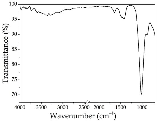 The spectrum for the BPA sample presented in Figure 4 shows a peak located at 3358 cm−1, which is attributed to the stretching vibration of the O-H bonds, that suggests that the material contains amorphous silicate or possible aluminum silicate and the peak at 1639 cm−1 is attributed to bending vibrations of H2O molecules [42]. The peaks at 1419 cm−1 and 1018 cm−1 are specific for stretching vibration of Si-O-Si and Al-O-Si bonds [43].