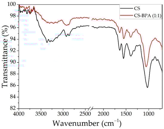 The ATR-FTIR analyses for the chitosan-based microbeads are presented in Figure 6, and the peak data are presented in Table 2. The basic characteristic peaks of the chitosan were shown at 3308 cm−1 (O–H stretch and N–H stretch, overlapped), 2929 and 2865 cm−1 (C–H stretch), 1641 cm−1 (NH2 deformation), 1556 cm−1 (N–H bend), 1029 cm−1 (C–O stretch, primary hydroxyl group), as reported in the literature [27,45]. When compared to the CS spectrum, the one for CS–BPA shows that the peak for O–H stretch and N–H stretch has a lower intensity, meaning that the BPA is bounded to the CS chemical structure.