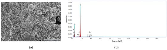 In order to study the morphology of the BPA surface obtained from banana peel waste, scanning electron microscopy (SEM) analyses, coupled with energy dispersive spectroscopy (EDS), were performed and also to identify the elements present in the sample. As can be seen in Figure 11a, the surfaces show homogeneity and porous appearance of the ash particles. The EDS pattern for the BPA sample (Figure 11b) exhibit a carbon content of 6.68%, oxygen 53.44%, magnesium 1.31%, aluminum 1.02%, silicon 35.97%, potassium 0.47%, and calcium 1.12%.