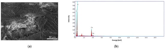 For the ALG–BPA (1:1) sample (Figure 13a), the surface shows small beads deposited in the cracks and all over the surface, indicating the encapsulation of the BPA in the ALG matrix. The energy dispersive X-ray (EDS) patterns of ALG–BPA (1:1) (Figure 13b) exhibit carbon content of 60.38 wt.%, oxygen 35.55 wt.%, calcium 1.03 wt.%, magnesium 1.46 wt.%, silicon 1.31 wt.%, and phosphorus of 0.27 wt.%. The presence of Si, Mg, and K elements is from adding the BPA in the ALG matrix.