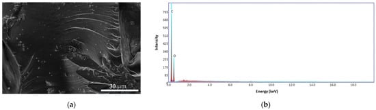 In Figure 15a, we can see that the surface of the CS–BPA (1:1) sample is irregular, with different aggregates formed on the surface, indicating the encapsulation of BPA in the chitosan chemical structure. The energy dispersive X-ray (EDS) patterns of the sample (Figure 15b) exhibit carbon content of 64.74 wt.%, oxygen of 33.28 wt.%, silicon of 1.73 wt.%, and traces of aluminum. The Al appears due to the support on which the sample is analyzed in the SEM equipment.