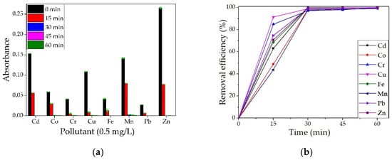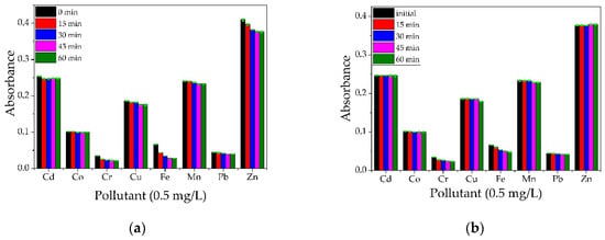 Samples were taken for analysis every 15 min, up to 60 min, with three repetitions per experiment. The averages of the three absorbance values read for each element are represented graphically in Figure 16a.