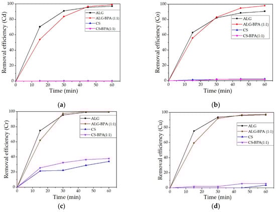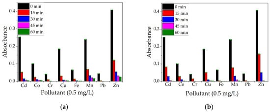 The materials were agitated with a magnetic stirrer to enhance the metal adsorption, and samples were taken every 15 min to observe the decrease in metal ions concentration. The metals studied were Cd, Co, Cr, Cu, Fe, Mn, Pb, and Zn. It can be observed from Figure 17a,b, that, when using ALG and ALG–BPA materials, in a period of 1 h, the absorbance for most metal ions decreases significantly, indicating a decrease in metal ion concentration in the water sample. Similar results for ALG-based materials were observed by researchers. In a study by Rapa et al. [33], alginate was combined in different proportions with starch and nano clays to form some new composites for the removal of Cu2+ ions from waters. They observed that the optimal ratio between components alginate/starch/n-clay was 1/2/3 (dried components) with a maximum removal efficiency of 95% for Cu2+ ions after 25 h of contact. The removal of Cu2+, Mg2+, Fe2+, and Pb2+ by using alginate combined with different nanocellulose biosorbents was studied by Abou-Zeid et al. [32]. They found that tri-carboxylate cellulose nanofibers (TPC-CNF) combined with alginate presented high removal efficiency for the metal ions studied with the best values obtained for Pb (95%) and Cu (92%), but a lower removal efficiency for Mg (54%) and Fe (43%).