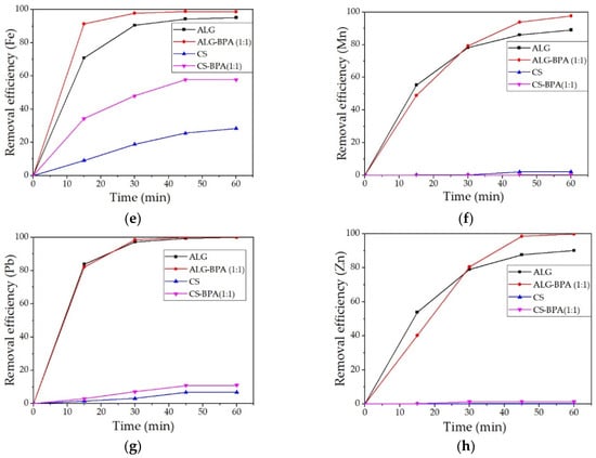 The removal efficiencies for heavy metal ions from water solution for the four types of microbeads are presented in Figure 19a–h. It can be observed that the most efficient material for the removal of most metals studied is the ALG–BPA (1:1) microbeads. They present over 95% removal efficiency for the metals studied and 100% removal efficiency for Cr, Fe, Pb, and Zn. The ALG microbeads also presented good removal efficiencies of metal ions, with values over 90%. The least efficient material was the CS microbeads. The best values were obtained for Cr and Fe ions with a removal efficiency of 34.14% and 28.38%, respectively. By adding BPA to CS, the adsorption properties of the material were slightly improved, but also only for Cr and Fe ions, to 37.09% and 57.78%.
